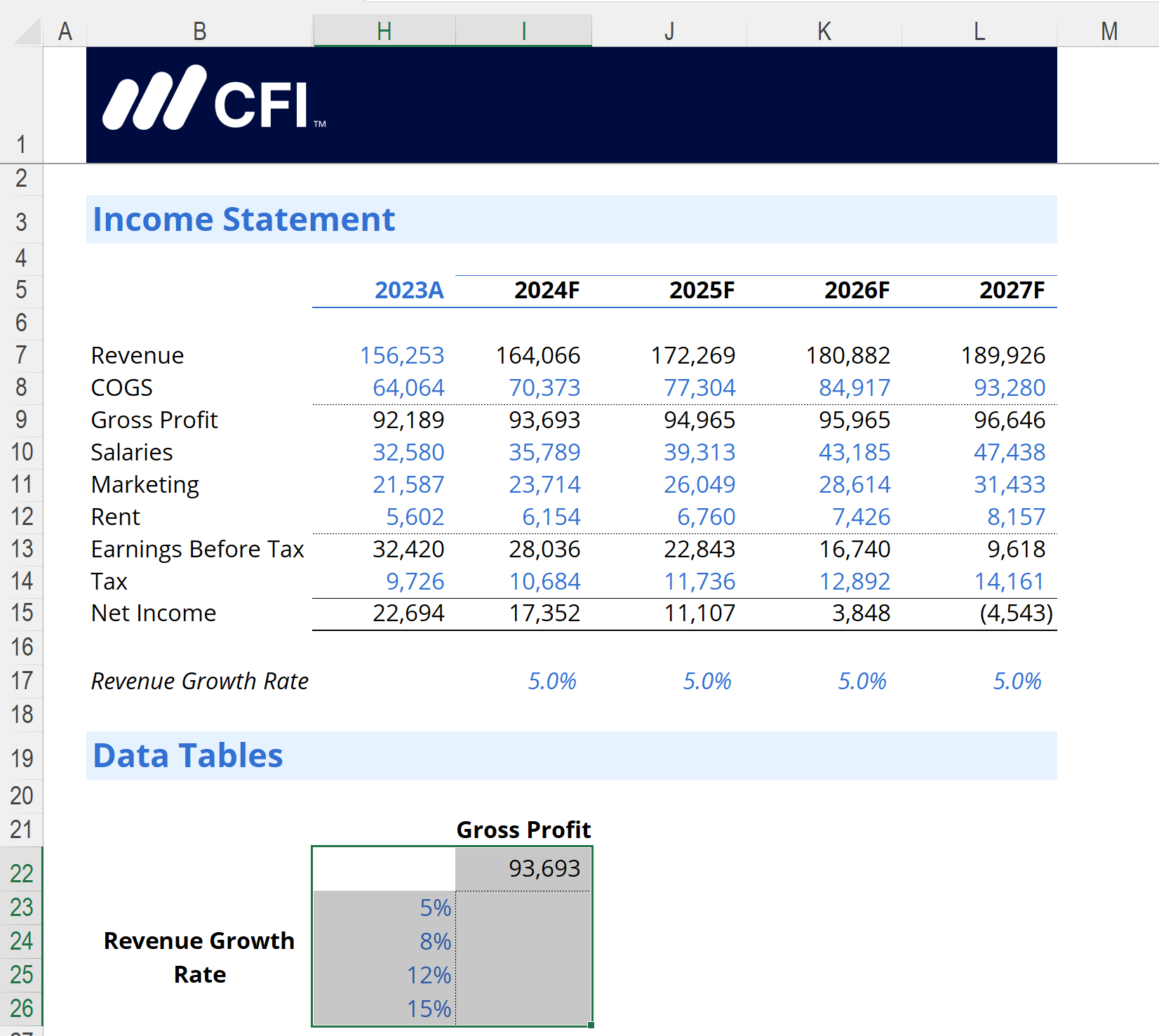 This formula takes the 2023 Revenue value and adjusts it by the growth rate shown below the Income Statement. This will update automatically when you run the Data Table.