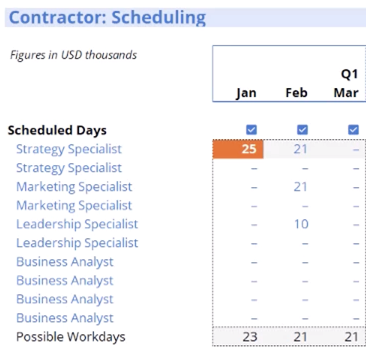 Set up a section to track days scheduled for each contractor type, such as Strategy Specialists who might only work during specific months. Include the maximum possible workdays in each month as a reference point, giving you a clear picture of capacity utilization.